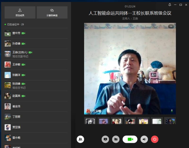2月22日上午9:00,人工智能191班召开视频特别班会,王宗敏校长、张启峰书记、王淼副书记、辅导员孙奇峰及人工191全体同学参加。