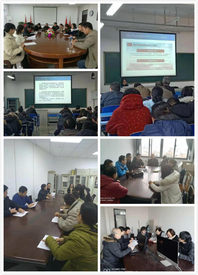 按照学校的要求,组织全体教师在3号组团A906集体学习教育部《新时代高校教师职业行为十项准则》(以下简称《准则》)和《高校教师师德失范行为处理的指导意见》(以下简称《意见》)。