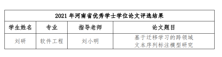 近日,河南省教育厅、河南省学位委员会下发了《关于批准2021年河南省优秀学位论文的决定》(教研〔2022〕295 号)文件,黄瓜视频 教师刘小明指导的《基于迁移学习的跨领域文本序列标注模型研究》被评为河南省优秀学士学位论文。