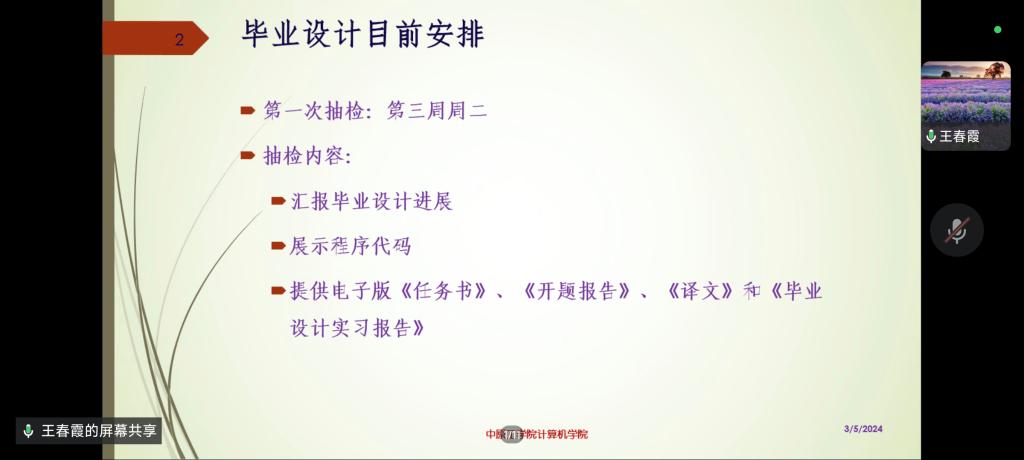 王春霞主任首先领学了教育部及学校毕业设计相关制度和文件,对毕业设计全过程进行了详细介绍,着重讲解了后续环节毕业实习、软硬件验收、论文查重、论文答辩以及毕业设计材料提交等流程和相关要求。王主任结合学院实际及自己多年毕业设计指导经验,将自己在毕业设计指导方面的一些心得体会进行了分享,并现场解答了同学们的疑问与困惑。