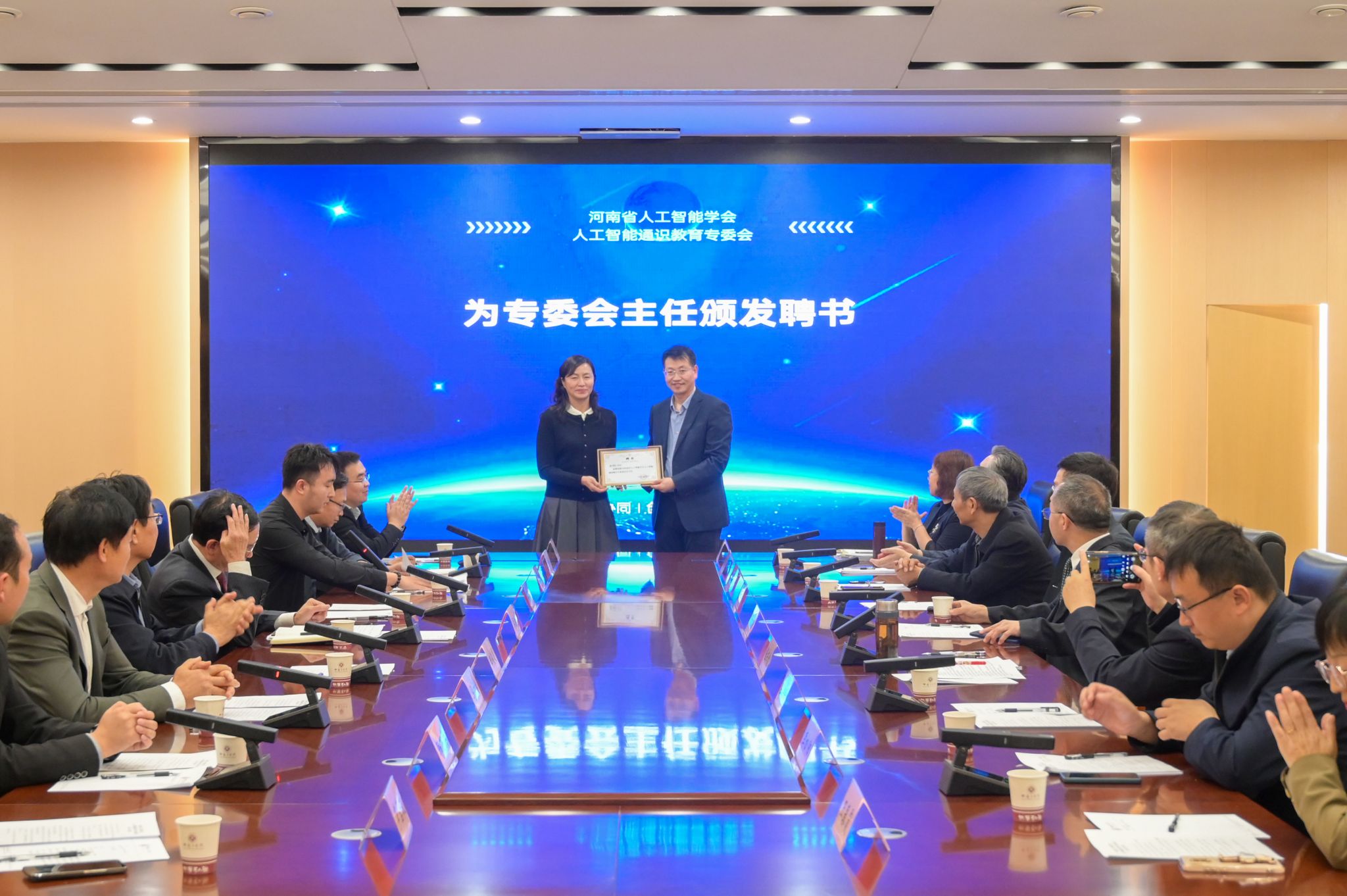 会上,集中学习习近平总书记关于人工智能的重要论述,深刻领会国家关于人工智能的战略部署。马广建宣读河南省人工智能学会关于专委会的批复文件,并为专委会授牌。吴廷伟为夏元清颁发专委会名誉主任聘书,路杨为张书钦颁发专委会主任聘书。