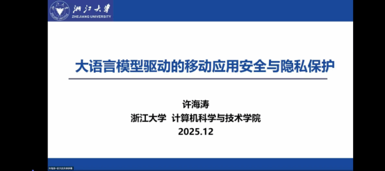 许海涛研究员长期深耕移动应用安全与人工智能隐私保护方向,在大语言模型安全性分析、非法APP检测等研究领域成果显著。报告中,他首先简要介绍了其在浙江大学组建的研究团队的发展历程与研究布局,随后系统梳理了当前移动应用生态中面临的关键安全挑战,并围绕团队近年来的重要研究成果进行深入讲解。