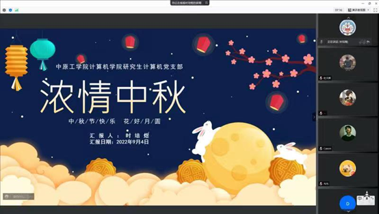 研究生计算机党支部以习近平新时代中国特色社会主义思想为指导,全面贯彻党的十九大和十九届历次全会精神,以培育和践行社会主义核心价值观为主线,以“浓情中秋”为载体,于9月10日晚开展了“我们的节日 中秋”主题线上活动,丰富中秋佳节的文化内涵,引导支部同志丰富对传统文化的了解。除介绍中秋节由来、神话传说、风俗习惯以及诗词歌赋等内容外,大家还在线分享吃月饼照片、家人在线欢聚场景、互致中秋佳节美好祝愿。