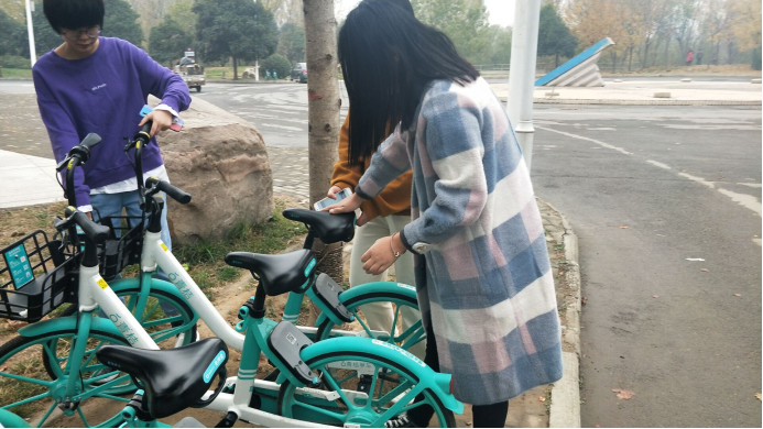 学生第一党支部组织开展“我是党员,我先行”的文明创建志愿服务活动,帮助并监督乱摆放的单车放回原处。