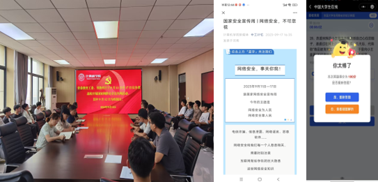 各班级、党、团支部围绕国家网络安全宣传周主题,通过主题班会、主题党(团)日、网络安全知识答题、反网络电信诈骗培训等活动,学院“中工计忆”微信公众号也进行了推文宣传,对广大学生、党团员进行全方位的网络安全教育。