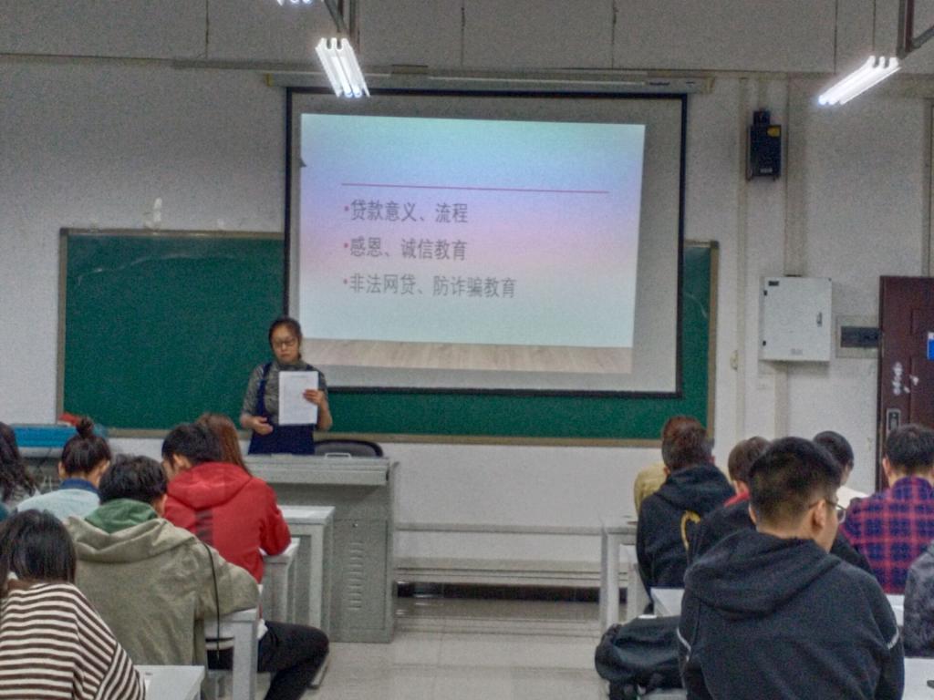 奖、助、贷、勤、补、免等全方位资助政策体系,然后重点依据国家高校贷款的申请条件、申请流程、材料准备、合同签订、还款流程等,并叮嘱学生按照时间节点做好申贷与续贷工作,提醒申请贷款的同学要及时登录在线系统进行信息维护。