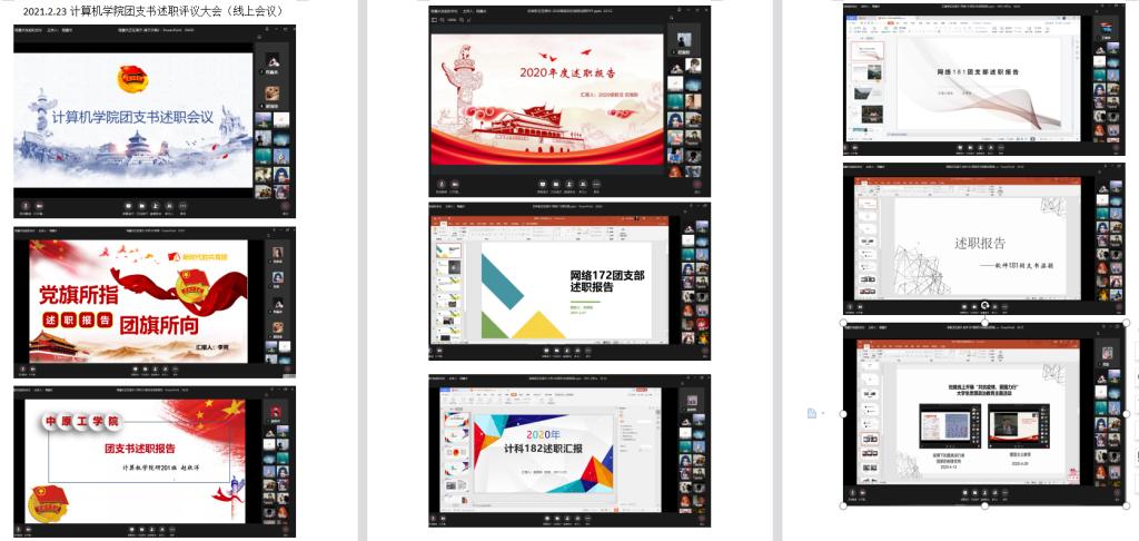 团总支负责老师侯向花、团总支副书记程鑫炎以及33名团支部书记、团员青年评议代表参加了此次会议。各位团支书除事先提交了述职报告外,还分别在视频会议中对过去一年团支部建设、工作开展情况、取得的成绩等内容进行了汇报,对不足之处进行反思,对下一步工作措施和支部规划进行交流。各团支部述职后,老师进行了点评,充分肯定了各团支书的工作成绩,并指出了存在的问题,同时希望团支书们能够在未来的工作和学习中继续保持热情、积极的态度,把自身成长融入支部建设中。