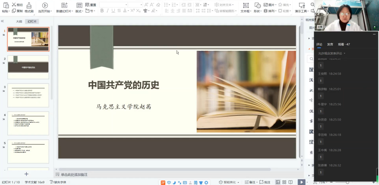 赵老师希望通过这四个方面,对我党百余年波澜壮阔的历史进行一个简单的总结,同时也表示仅通过课堂的时间远远不足以深入了解我党的历史,并希望各位学员以这四个方面作为启示,认真研习党史,加强自身的专业理论学习,早日成为发展对象和一个合格的中共党员。