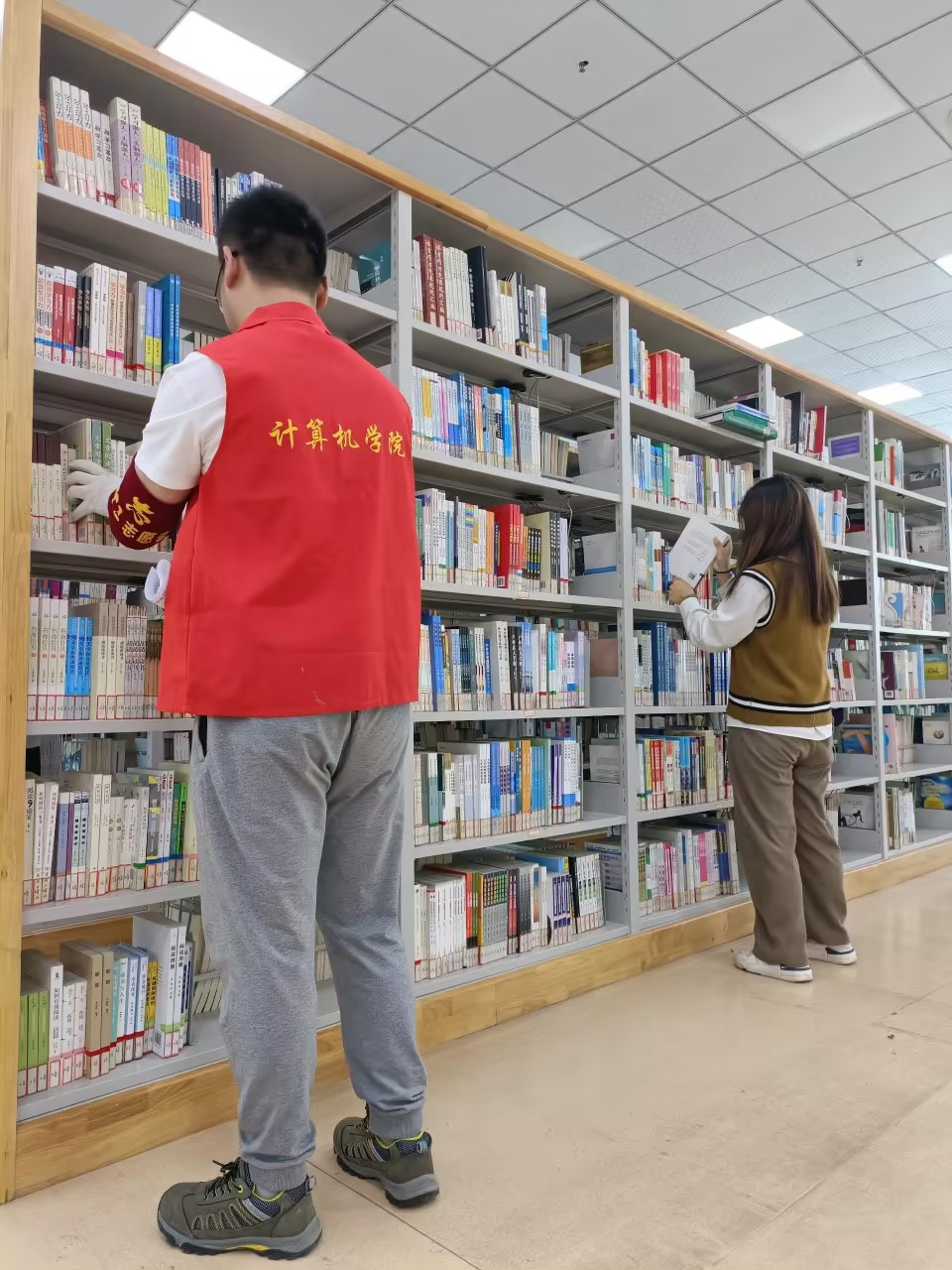 在图书馆志愿活动中,这些志愿者们身穿红马甲积极投入,在一排排书架之间穿梭不停、辛勤工作,不仅使图书馆环境更加整洁有序,也为同学们提供了更好的学习氛围。志愿者们积极的态度和良好的服务效果得到了在场工作人员的一致好评。