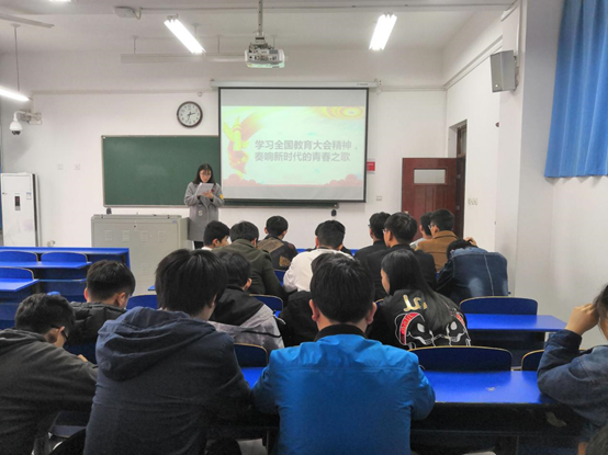 活动当天,团支部书记向团支部成员分享了全国教育大会精神的PPT。团支部成员张懋伟分享了学习贯彻全国教育大会精神的心得以及相关视频,引导支部成员深刻理解召开全国教育大会的时代背景,充分认识召开全国教育大会的重要性,准确把握全国教育大会战略要求,切实增强学习贯彻习近平总书记重要讲话和大会精神的责任感、使命感。