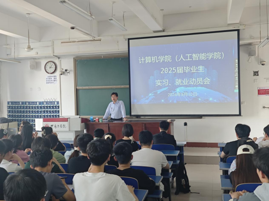 (人工智能学院)于2024年5月10日在龙湖校区3号教学楼311教室召开了2025届毕业生实习就业动员会,动员会由学院党委书记吕继东主讲,学院2025届本科毕业生、学院副书记侯向花、辅导员姜茜参会。